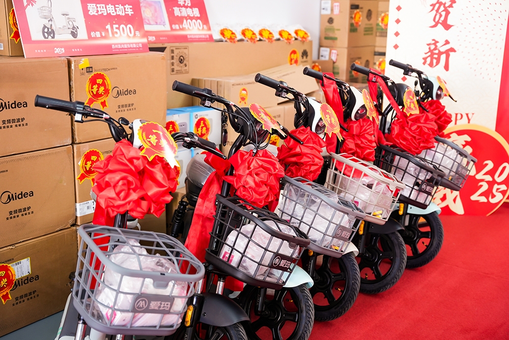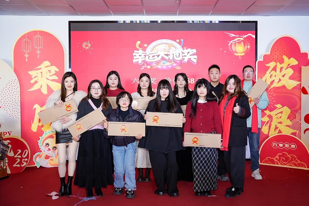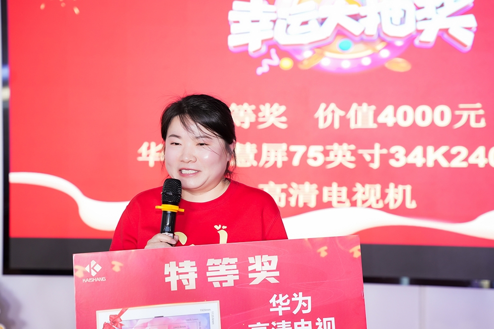 在年会的抽奖环节中,众多精美奖品逐一揭晓。美的除螨仪、惠普投影仪、罗技机械键盘、多功能烤箱、智能洗地机以及75英寸华为智慧屏等高端奖品逐一被抽出,每位员工都抽到了自己满意的奖品,脸上洋溢着幸福的笑容。
